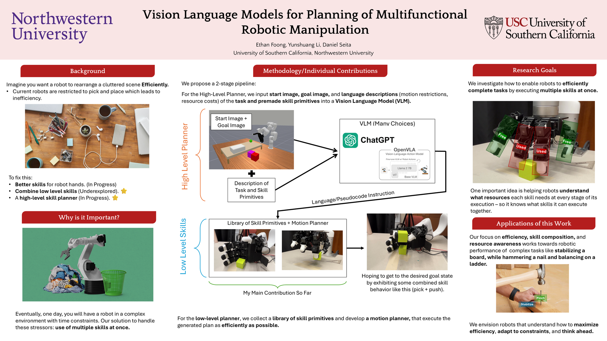 Over the summer of 2025, I worked with the SLURM Lab at USC on a project investigating multifunctional robot manipulation. This slide shows our motivation and some of the ways we've thought of solving the problem (although this method is not one we are pursuing anymore).