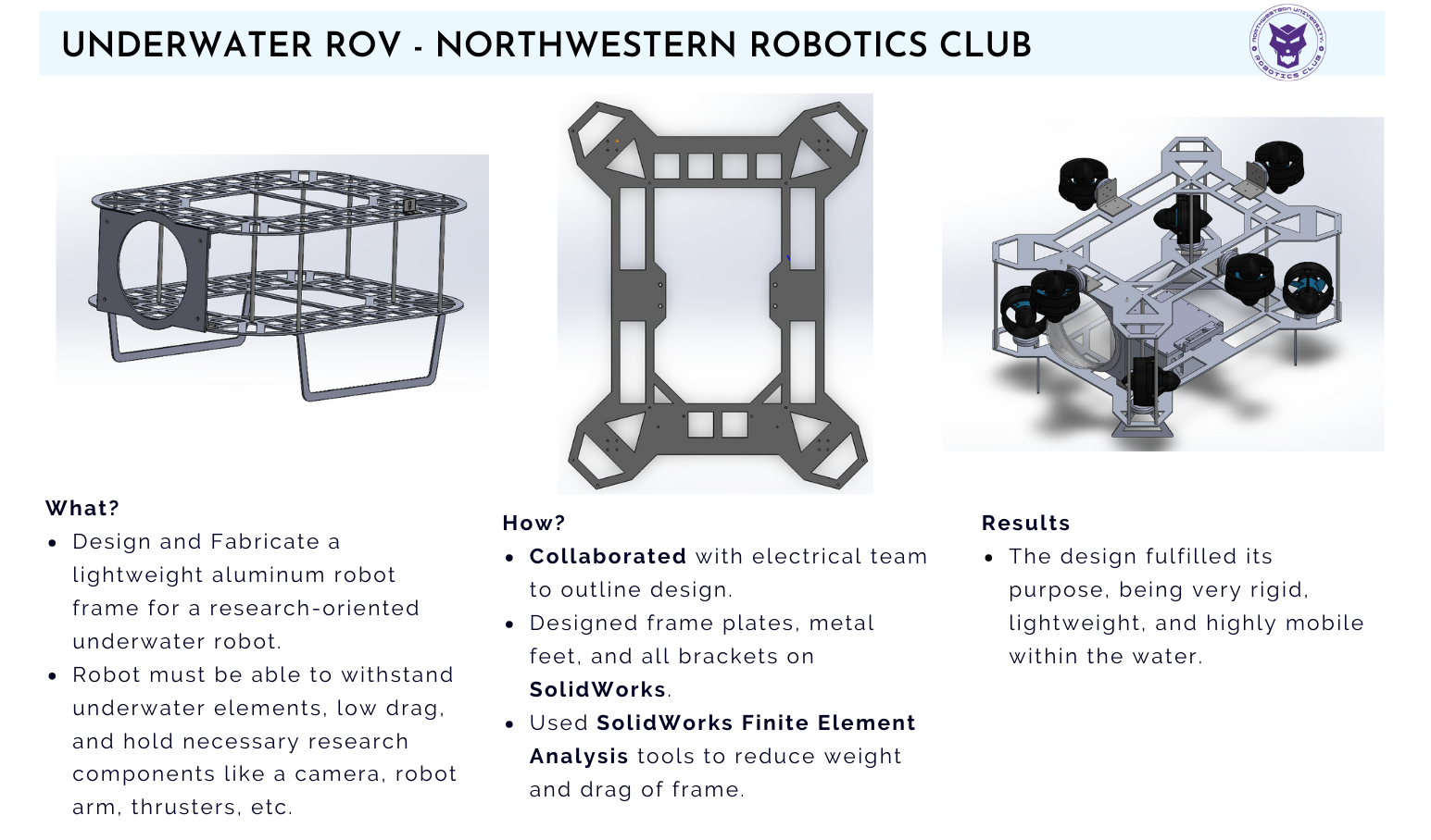 Since my freshman year at Northwestern, I've been a part of the underwater ROV division of our robotics club. During this time, one of my major projects has been designing a new robot frame in SolidWorks and performing FEA on the frame to optimize its drag and mass characteristics in the water.